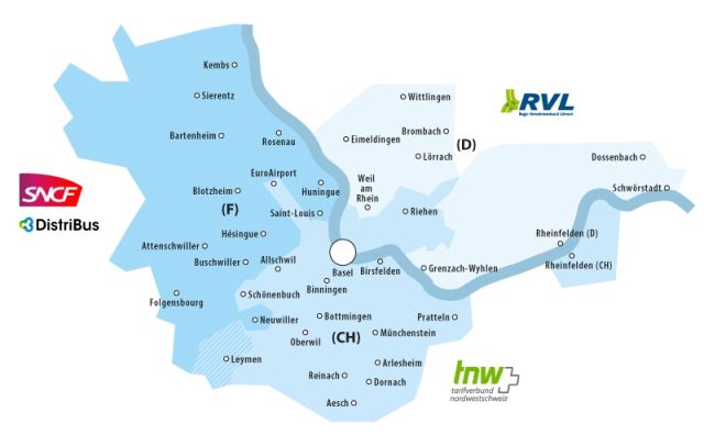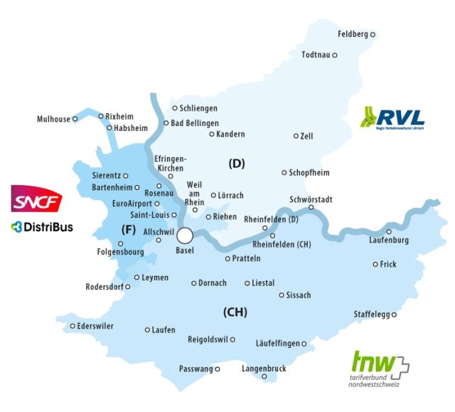 The ticket triregio is a day ticket valid for 24 hours in the three-nation triangle - covering areas in Northwestern Switzerland, the district of Lörrach (Germany), the Saint-Louis Agglomération (Distribus, France) and TER (SNCF) to Mulhouse, France (not valid on TGV trains).