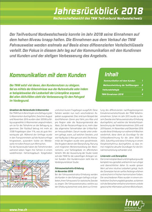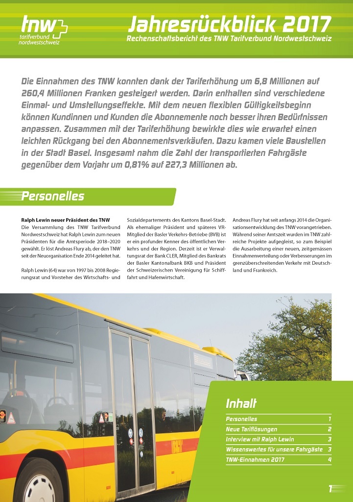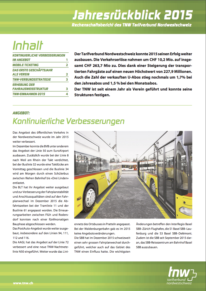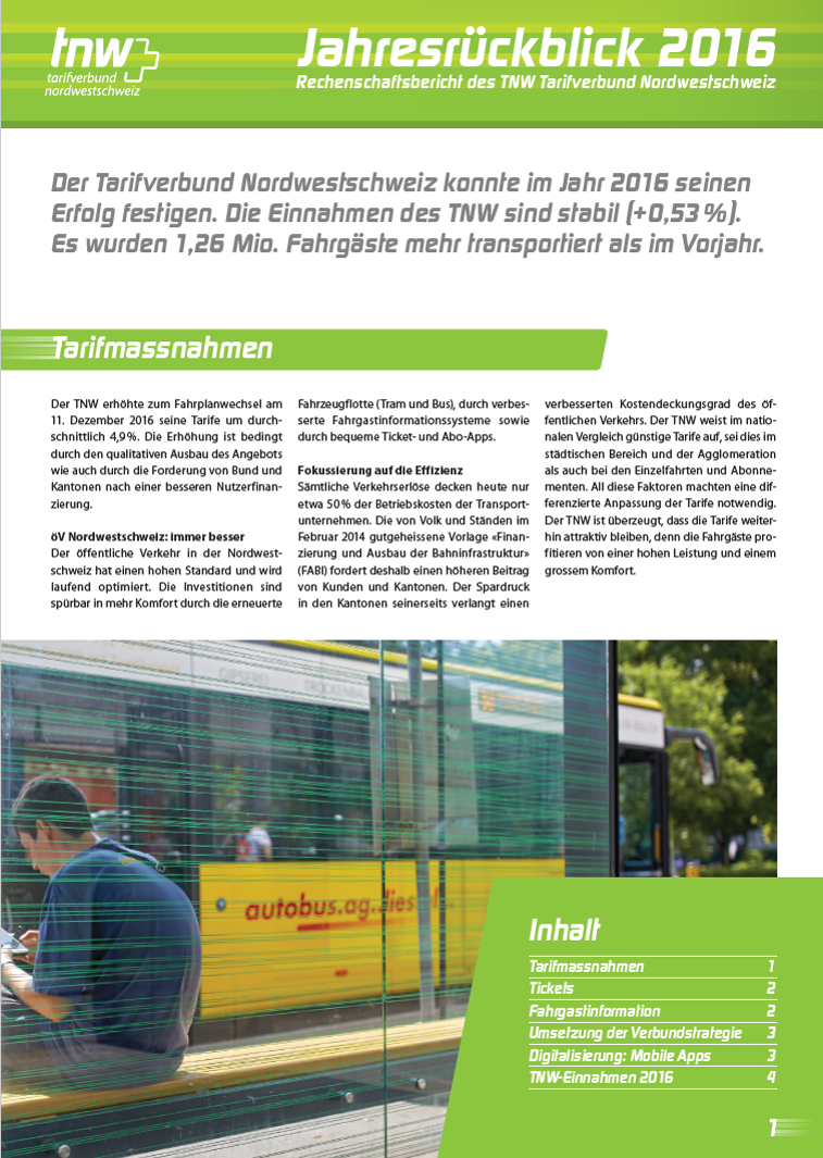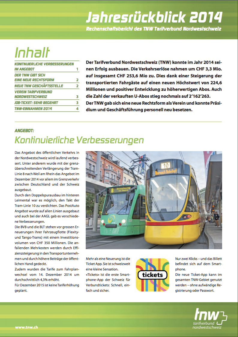 Der TNW zählte 228,01 Millionen Fahrgäste im Jahr 2024. Dies waren 2,8 % mehr als im Vorjahr, der Wert lag noch 6,2 % unterhalb des Vor-Pandemie-Niveaus. Die Einnahmen stiegen stärker als die Fahrgastzahlen, dies ist auf die im Dezember 2023 durchgeführten Tarifmassnahmen zurückzuführen: Mit Erlösen in der Höhe von CHF 240,9 Mio. konnte gegenüber dem Vorjahr ein Wachstum von 6,0 % erreicht werden, womit der Rückstand zum Jahr 2019 nur noch 1,8 % betrug. Insbesondere die Anzahl an verkauften Jahresabos nahm stetig zu und lag gegen Ende Jahr auf dem Niveau von vor der Pandemie. Auf weiterhin hohem Niveau halten sich die Erträge bei den Bartarifen, welche Einzelfahrausweise und Mehrfahrtenkarten enthalten. Diese lagen im Jahr 2024 7,0 % über dem Vorjahr und 14,4 % über dem Niveau des Vor-Pandemie-Jahres 2019. Etliche Kundinnen und Kunden haben ihren veränderten Bedürfnissen entsprechend Einzelbillette und nicht wie früher Abos gekauft. Der Erlös aus den Abo-Verkäufen lag im Jahr 2024 5,5 % über dem Vorjahr und 8,5 % unter dem Wert des Jahres 2019.